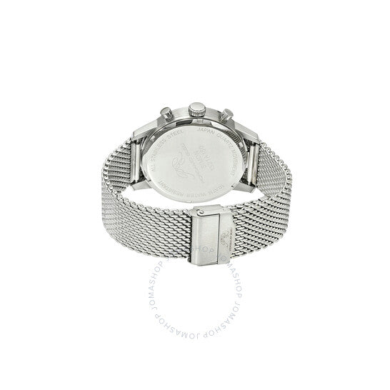 Porsamo Bleu Simon Chronograph Men's Watch; Stainless Steel Mesh Band; Silver and White Silver-tone stainless steel case and bracelet. Fixed silver-tone stainless steel bezel. Silver-tone dial with silver-tone hands and index hour markers. Minute markers around the outer rim. Dial Type: Analog. Luminescent hands and markers. Quartz movement. Scratch resistant mineral crystal. Pull / push crown. Solid case back. Round case shape, case size: 44 mm. Band width: 22 mm. Fold over with double push button release clasp. Water resistant at 100 meters / 330 feet. Functions: chronograph, hour, minute, second. Simon Series. Luxury watch style. Watch label: Japan Movt. Porsamo Bleu Simon Chronograph Quartz Silver Dial Men's Watch 1321ASIS.
