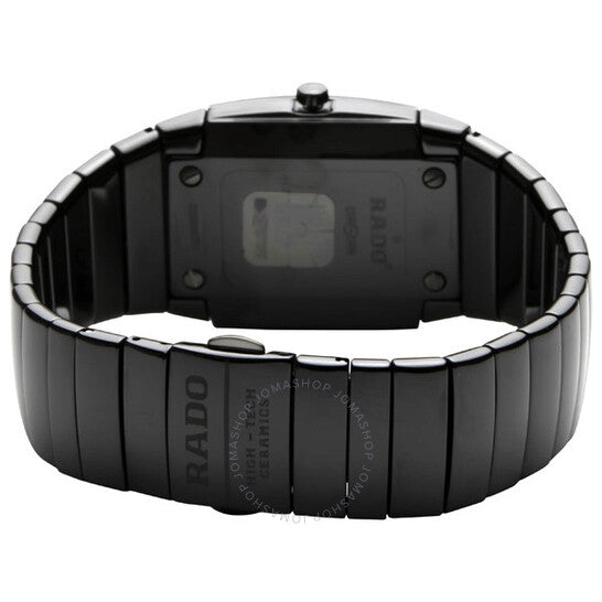 Black ceramic case with a black ceramic bracelet. Fixed black ceramic bezel. Black dial with luminous silver-tone hands. Diamonds set at the 3, 9 and 12 o'clock positions. Dial Type: Analog. Luminescent hands. Date display at the 6 o'clock position. Quartz movement. Scratch resistant sapphire crystal. Pull / push crown. Solid case back. Square case shape. Case size: 30 mm. Case thickness: 9 mm. Butterfly clasp. Water resistant at 30 meters / 100 feet. Functions: date, hour, minute, second. Sintra Series. Casual watch style. Watch label: Swiss Made. Item Variations: DO R13725702, DO.R13725702, DOR13725702. Rado Sintra Jubile Diamond Black Dial Men's Watch DO-R13725702.
