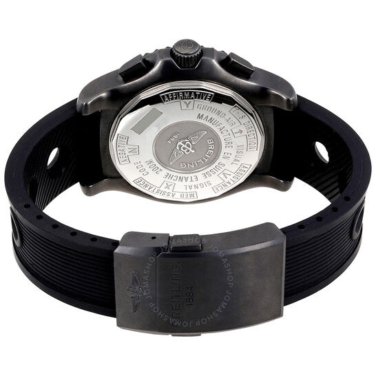 Stainless steel case with a black ocean racer rubber strap. Uni-directional rotating bezel. Black dial with silver-tone hands and stick hour markers. Minute markers around the outer rim. Dial Type: Analog. Luminescent hands and markers. Date display at the 6 o'clock position. Chronograph - two sub-dials displaying: 60 second, 60 minute/12 hour. Breitling Calibre 27 automatic movement with about 42 hours of power reserve. Scratch resistant sapphire crystal. Screw down crown. Solid case back. Case size: 43.5 mm. Case thickness: 16 mm. Round case shape. Band width: 22 mm. Fold over clasp. Water resistant at 200 meters / 660 feet. Functions: chronograph, chronometer, date, hour, minute, second. Luxury watch style. Watch label: Certifie Chronometre. Item Variations: M27363A3 B823BKOR, M27363A3.B823BKOR, M27363A3B823BKOR. Breitling Skyracer Raven Chronograph Automatic Men's Watch M27363A3-B823BKOR.