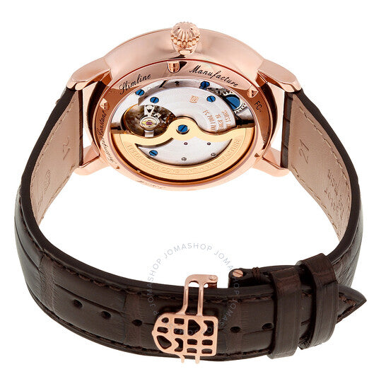 Rose gold-tone stainless steel case with a brown leather strap. Fixed rose gold-tone bezel. Silver dial with rose gold-tone hands and index hour markers. Dial Type: Analog. Date sub-dial at the 6 o'clock position. Frederique Constant calibre FC-710 automatic movement with about 42 hours of power reserve. Scratch resistant sapphire crystal. Pull / push crown. Skeleton case back. Case size: 42 mm. Case thickness: 11.7 mm. Round case shape. Band width: 22 mm. Band length: 9 inches. Deployment with push button release clasp. Water resistant at 50 meters / 165 feet. Functions: date, hour, minute, second. Luxury watch style. Watch label: Swiss Made. Item Variations: FC 710V4S4, FC.710V4S4, FC710V4S4. Frederique Constant Slimline Automatic Silver Dial Brown Leather Men's Watch FC-710V4S4.
