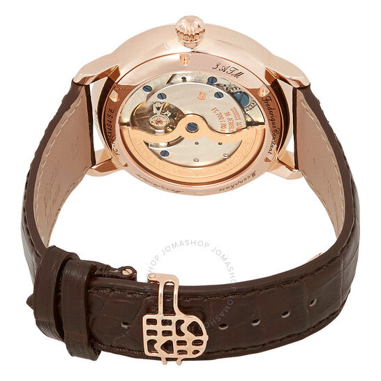 Rose gold-plated stainless steel case with a dark brown alligator leather strap. Fixed rose gold-plated bezel. Silver dial with black leaf-style shape hands and Roman numeral hour markers. Dial Type: Analog. Date display at the 6 o'clock position. Combination date / moonphase) sub-dial. Frederique Constant calibre FC-705 automatic movement, containing 26 Jewels, composed of 145 parts, bitting at 28800 vph, and has a power reserve of approximately 42 hours. Scratch resistant convex sapphire crystal crystal. Pull / push crown. Transparent case back. Round case shape. Case size: 42 mm. Case thickness: 12 mm. Band width: 21 mm. Deployment clasp. Water resistant at 30 meters / 100 feet. Functions: moon phase, date, hour, minute. Casual watch style. Watch label: Swiss Made. Frederique Constant Slimline Moonphase Automatic Silver Dial Men's Watch FC-705WR4S4.