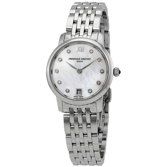 Silver-tone stainless steel case with a silver-tone stainless steel bracelet. Fixed silver-tone stainless steel bezel. White mother of pearl dial with silver-tone leaf-style shape hands and diamond hour markers. Roman numeral appears at the 12 o'clock position. Dial Type: Analog. Date display at the 6 o'clock position. Frederique Constant Calibre FC-220 quartz movement. Scratch resistant sapphire crystal. Pull / push crown. Solid case back. Round case shape. Case size: 30 mm. Deployment clasp. Water resistant at 30 meters / 100 feet. Functions: date, hour, minute. Dress watch style. Watch label: Swiss Made. Frederique Constant Slimline Quartz Diamond Ladies Watch FC-220MPWD1S26B.