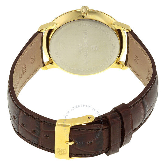 Yellow gold-plated stainless steel case with a brown leather strap. Fixed yellow gold-plated bezel. Silver dial with yellow gold-tone leaf-stylehands and index hour markers. Minute markers around the outer rim. Dial Type: Analog. Date display at the 3 o'clock position. Frederique Constant calibre FC-220 quartz movement. Scratch resistant sapphire crystal. Pull / push crown. Solid case back. Round case shape. Case size: 38.4 mm. Case thickness: 5.8 mm. Band width: 20 mm. Band length: 8 inches. Tang clasp. Water resistant at 30 meters / 100 feet. Functions: date, hour, minute. Casual watch style. Watch label: Swiss Made. Item Variations: FC 220V5S5, FC.220V5S5, FC220V5S5. Frederique Constant Slimline Silver Dial Men's Watch FC-220V5S5.