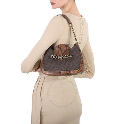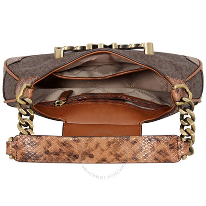 Michael Kors Ladies Shoulder Bag. SKU: 30H1A2HL0E-227. Barcode: 194900929421. Color: Brown. Size: 26 x 6 x 19 cm. Michael Kors Small Hally Signature Logo Print Shoulder Bag. This Michael Kors Hally small aged leather shoulder bag is shaped by the popular underarm bag and is paneled with the label's signature logo print and brown python-print leather panels. Material: Leather.