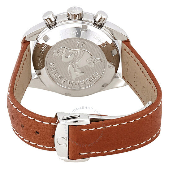Stainless steel case with a brown (calfskin) leather strap. Fixed stainless steel bezel with a grey aluminium ring showing tachymeter markings. Silver opaline dial with luminous rose gold-tone hands and index hour markers. Minute markers around the outer rim. Dial Type: Analog. Luminescent hands and markers. Date display at the 6 o'clock position. Chronograph - three sub-dials displaying: 60 second, 30 minute and 12 hours. Omega calibre 3330 automatic movement with a 52-hour power reserve. Scratch resistant sapphire crystal. Screw down crown. Solid case back. Round case shape. Case size: 38 mm. Band width: 18 mm. Fold over clasp. Water resistant at 100 meters / 330 feet. Functions: chronograph, date, hour, minute, second. Dress watch style. Watch label: Swiss Made. Omega Speedmaster Automatic Silver Dial Men's Watch 324.32.38.50.02.001.