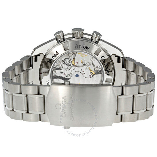 Stainless steel case with a stainless steel bracelet. Fixed stainless steel bezel with tachymeter. Black dial with luminous hands and Arabic numeral hour markers. Minute markers around the outer rim. Dial Type: Analog. Date display appears between the 4 and 5 o'clock position. Chronograph - three sub-dials displaying: 12 hours, 30 minutes and 60 seconds. Automatic movement. Scratch resistant sapphire crystal. Skeleton case back. Case diameter: 44.25 mm. Case thickness: 15.4 mm. Band width: 21 mm. Push button fold over clasp. Water resistant at 100 meters/ 330 feet. Functions: hours, minutes, seconds, date, chronograph, tachymeter. Luxury watch style. Watch label: Swiss Made. Omega Speedmaster Broad Arrow Black Dial Automatic Men's Watch 321.10.44.50.01.001.