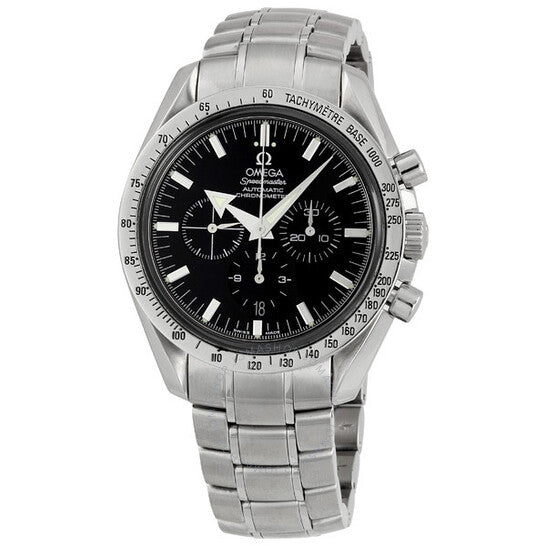 Stainless steel case with a stainless steel link bracelet. Fixed stainless steel bezel with tachymeter. Black dial with luminous silver hands and index hour markers. Minute markers around the outer rim. Date display at the 6 o'clock position. Chronograph - three sub-dials displaying: 60 seconds, 60 minutes and 12 hours. Automatic movement. Scratch resistant sapphire crystal. Case diameter: 38.8 mm. Case thickness: 14.5 mm. Push button deployment clasp. Water resistant at 100 meters / 330 feet. Additional Info: 3551.50, 3551.50.00, 3551-50, 3551-50-00, 3551/50, 355150, 3551. Omega Speedmaster Broad Arrow Chronograph Men's Watch 3551.50.