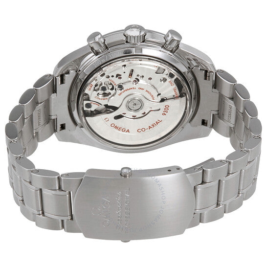 Stainless steel case with a stainless steel bracelet. Fixed stainless steel bezel with black top ring showing tachymeter markings. Black dial with luminous silver-tone hands and index hour markers. Minute markers around the outer rim. Dial Type: Analog. Luminescent hands and markers. Date display at the 6 o'clock position. Two sub-dials displaying: 60 second and 12 hours. Automatic movement with a 60-hour power reserve. Scratch resistant sapphire crystal. Pull / push crown. Skeleton case back. Case diameter: 44.2 mm. Case thickness: 14 mm. Round case shape. Band width: 20 mm. Band length: 9.5 inches. Deployment clasp with push button release. Water resistant at 100 meters / 330 feet. Functions: chronograph, tachymeter, date, hour, minute, second. Casual watch style. Watch label: Swiss Made. Item Variations: 311 30 44 51 01 002, 311-30-44-51-01-002, 311/30/44/51/01/002, 31130445101002. Omega Speedmaster Moon Black Dial Stainless Steel Men's Watch 311.30.44.51.01.002.