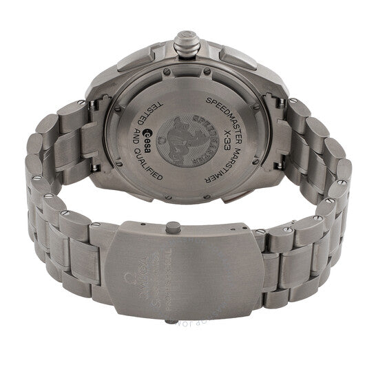 Grey titanium case and bracelet. Bi-directional rotating bezel. Black dial with silver-tone hands and index hour markers. Minute markers around the outer rim. Dial Type: Analog-digital. Luminescent hands and markers. Omega Calibre 5622 quartz movement. Scratch resistant sapphire crystal. Pull / Push crown. Solid case back. Round case shape, case size: 45 mm. Fold over clasp with a safety release. Water resistant at 300 meters / 1000 feet. Functions: perpetual calendar. Additional Info: original box, manual (complete accessories). Speedmaster Series. Dive watch style. Watch label: Swiss Made. Omega Speedmaster Perpetual Quartz Analog-Digital Black Dial Men's Watch 318.90.45.79.01.003.