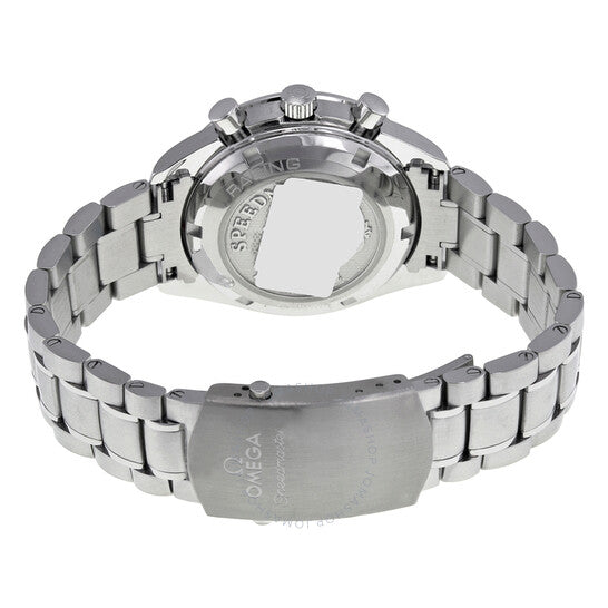 Silver-tone stainless steel case and bracelet. Fixed silver-tone stainless steel bezel with a black aluminum ring. Black and silver dial with luminous silver-tone hands and index hour markers. Minute markers around the outer rim. Dial Type: Analog. Luminescent hands and markers. Date display at the 6 o'clock position. Chronograph - three sub-dials displaying: 60 second, 30 minute and 12 hour. Omega Calibre 3330 Automatic movement, based upon ETA Valjoux 7753, containing 31 Jewels, bitting at 28800 vph, and has a power reserve of approximately 52 hours. Scratch resistant sapphire crystal. Screw down crown. Solid case back. Round case shape, case size: 40 mm, case thickness: 15 mm. Band width: 19 mm, band length: 8.5 inches. Deployment with push button release clasp. Water resistant at 100 meters / 330 feet. Functions: chronograph, date, hour, minute, second, chronometer, tachymeter. Speedmaster Racing Series. Casual watch style. Watch label: Swiss Made. Item Variations: 32630405001002. Omega Speedmaster Racing Black Dial Men's Watch 32630405001002.