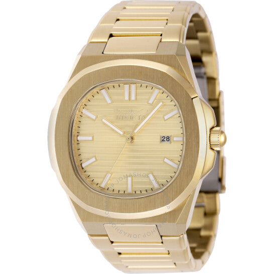 Gold-tone stainless steel case and bracelet. Fixed gold-tone stainless steel bezel. Gold-tone dial with gold-tone hands and index hour markers. Minute markers around the outer rim. Dial Type: Analog. Luminescent hands and markers. Date display at the 3 o'clock position. Hattori Caliber PC32 quartz movement. Scratch resistant mineral crystal. Pull / push crown. Solid case back. Oval case shape, case size: 41 mm, case thickness: 12.10 mm. Band width: 26 mm, band length: 7.25 inches. Fold over safety clasp. Water resistant at 50 meters / 165 feet. Functions: date, hour, minute, second. Speedway Series. Casual watch style. Watch label: Japan Movt. Invicta Speedway Quartz Gold Dial Men's Watch 48520.