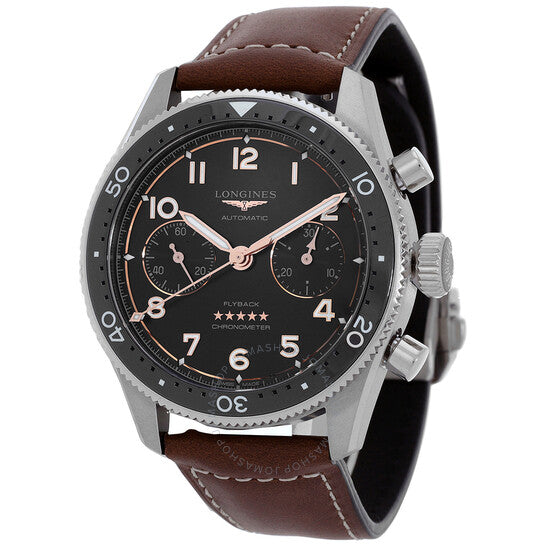 Silver-tone stainless steel case with a brown leather strap. Bi-directional rotating black ceramic bezel. Black dial with rose gold-tone hands and Arabic numeral hour markers. Minute markers around the outer rim. Dial Type: Analog. Luminescent hands and markers. Chronograph - two sub-dials displaying: 60 second and 30 minute. Longines Calibre L791 automatic movement. Scratch resistant sapphire crystal. Screw down crown. Transparent see through case back. Round case shape, case size: 42 mm. Deployment with push button release clasp. Water resistant at 100 meters / 330 feet. Functions: chronograph, hour, minute, second. Additional Info: original box, international warranty card, manual (complete accessories). Spirit Flyback Series. Luxury watch style. Watch label: Swiss Made. Longines Spirit Flyback Chronograph Automatic Black Dial Men's Watch L3.821.4.53.2.