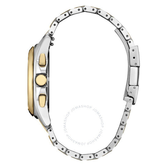 Silver-tone stainless steel case with a two-tone (silver-tone and gold-tone) stainless steel bracelet. Fixed gold-tone stainless steel bezel. Green dial with gold-tone hands and index hour markers. Minute markers around the outer rim. Dial Type: Analog. Luminescent hands. Date display between 4 and 5 o'clock position. Chronograph - three sub-dials displaying: 60 second, 60 minute and 24 hour. Citizen Caliber Eco-Drive B620 eco-drive movement. Scratch resistant sapphire crystal. Solid case back. Round case shape, case size: 40.5 mm. Fold over clasp with a safety release. Water resistant at 100 meters / 330 feet. Functions: chronograph, date, hour, minute, second, solar-powered. Sport Luxury Series. Sport watch style. Watch label: Japan Movt. Citizen Sport Luxury Chronograph Green Dial Men's Watch CA4684-54X.