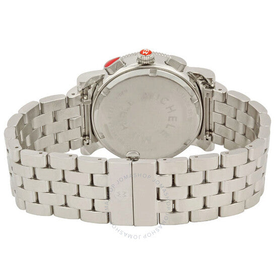 Stainless steel case with a stainless steel bracelet. Fixed bezel. Hot pink dial with luminous hands and stick hour markers. Minute markers around the outer rim. Date displays at the 6 o'clock position. Chronograph - three sub-dials displaying: 1/10th second, 30 minutes and 60 seconds. Quartz movement. Scratch resistant sapphire crystal. Solid case back. Case diameter: 20 mm. Deployment clasp. Water resistant at 50 meters/ 165 feet. Functions: hours, minutes, seconds, date, chronograph. Michele Sport Sail Hot Pink Dial Ladies Watch MWW01C000025.