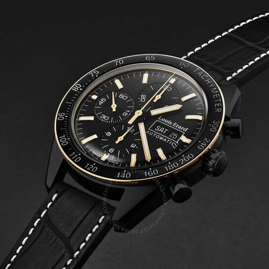 Black stainless steel case with a black leather strap. Fixed tachymeter scale black stainless steel bezel. Black dial with rose gold-tone hands and index hour markers. Minute markers around the outer rim. Dial Type: Analog. Luminescent hands and markers. Day of the week and date display at the 3 o'clock position. Chronograph - three sub-dials displaying: 60 second, 30 minute and 12 hour. Automatic movement. Scratch resistant sapphire crystal. Pull / push crown. Transparent case back. Round case shape, case size: 44 mm, case thickness: 15 mm. Band width: 20 mm, band length: 8 inches. Deployment with push button release clasp. Water resistant at 50 meters / 165 feet. Functions: chronograph, day, date, hour, minute, second. Additional Info: hours, minutes, small seconds, day-date, chronograph. Sportive Series. Luxury watch style. Watch label: Swiss Made. Louis Erard Sportive Chronograph Automatic Black Dial Men's Watch 78109NB12.BDCN152.