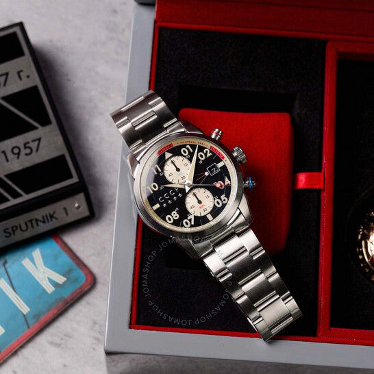 Silver-tone stainless steel case and bracelet. Fixed silver-tone stainless steel bezel. Black dial with silver-tone hands and Arabic numeral & index hour markers. Minute markers around the outer rim. Dial Type: Analog. Luminescent hands and markers. Date display at the 3 o'clock position. Chronograph - two sub-dials displaying: 60 second and 30 minute. Quartz movement. Scratch resistant mineral crystal. Solid case back. Round case shape, case size: 44 mm, case thickness: 13 mm. Band width: 22 mm, band length: 8 inches. Fold over clasp with a safety release. Functions: chronograph, date, hour, minute, second. Sputnik Chronograph Series. Fashion watch style. CCCP Sputnik Chronograph Quartz Black Dial Men's Watch CP-7098-11.