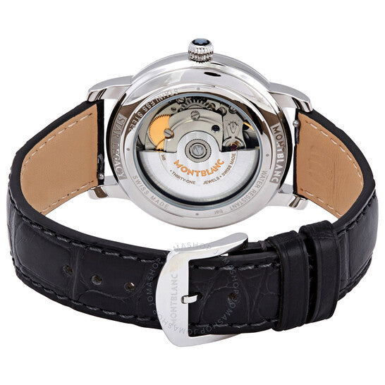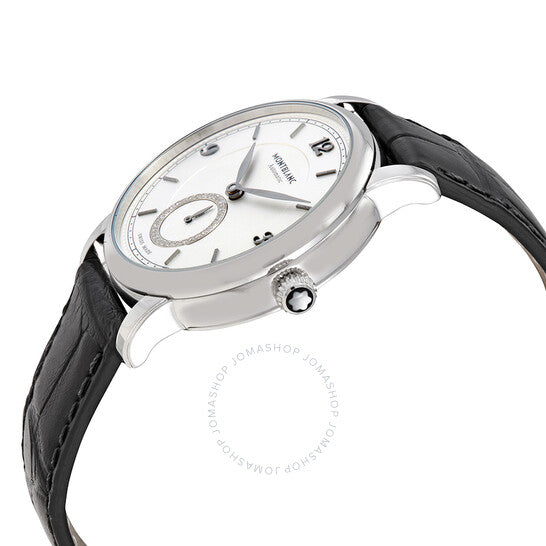 Silver-tone stainless steel case with a black leather strap. Fixed silver-tone stainless steel bezel. Silvery white dial with anthracite leaf-style shape hands and index hour markers. Arabic numerals mark the 3, 9 and 12 o'clock positions. minute markers around the outer rim. Dial Type: Analog. One subdial displaying: small second. MontBlanc Calibre MB 24.16 Automatic movement, based upon Sellita SW260-1, containing 31 Jewels, bitting at 28800 vph, and has a power reserve of approximately 38 hours. Scratch resistant sapphire crystal. Pull / push crown. Transparent case back. Round case shape, case size: 36 mm, case thickness: 10.75 mm. Band width: 18 mm. Tang clasp. Water resistant at 50 meters / 165 feet. Functions: hour, minute, second. Additional Info: small-seconds counter set with 32 diamonds (~0.064 ct). Star Legacy Series. Luxury watch style. Watch label: Swiss Made. Montblanc Star Legacy Automatic Silvery White Dial Ladies Watch 118510.
