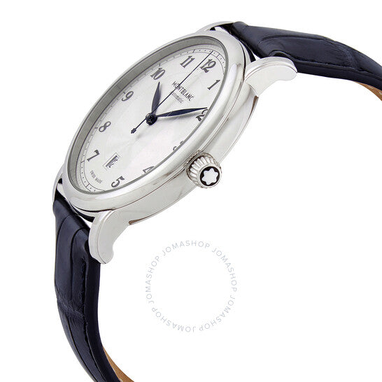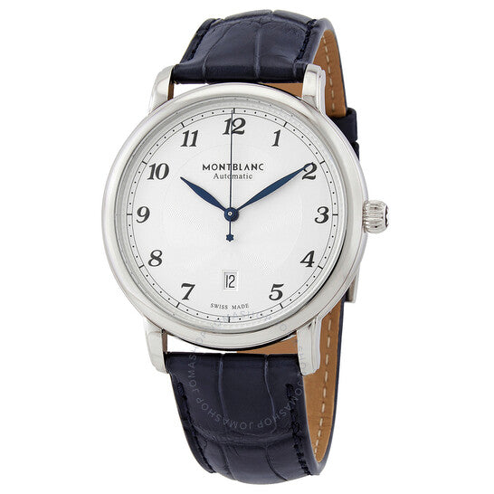 Stainless steel case with a blue (alligator) leather strap. Fixed stainless steel bezel. Silvery white dial with blue hands and Arabic numeral hour markers. Minute markers around the outer rim. Dial Type: Analog. Date display above the 6 o'clock position. Caliber MB 24.01 automatic movement with a 42-hour power reserve. Scratch resistant sapphire crystal. Transparent case back. Round case shape. Case size: 42 mm. Case thickness: 9.53 mm. Band width: 20 mm. Tang clasp. Water resistant at 30 meters / 100 feet. Functions: date, hour, minute, second. Star Legacy Series. Luxury watch style. Watch label: Swiss Made. Montblanc Star Legacy Automatic Silvery White Dial Men's Watch 117575.