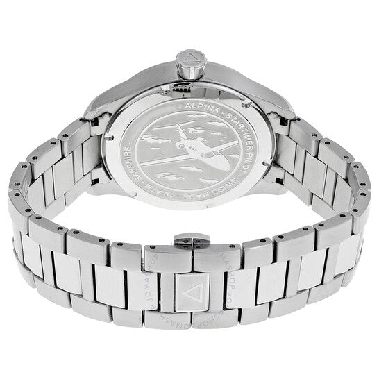 Silver-tone stainless steel case with a silver-tone stainless steel bracelet. Fixed silver-tone stainless steel bezel. Black dial with luminous white hands and Arabic numeral hour markers. Alpina logo marks the 12 o'clock position. minute markers around the outer rim. Dial Type: Analog. Luminescent hands. Date display at the 6 o'clock position. Small second subdial. Alpina Calibre AL-280 quartz movement. Scratch resistant sapphire crystal. Solid case back. Round case shape, case size: 44 mm, case thickness: 12 mm. Band width: 22 mm / 20 mm, band length: 8 inches. Deployment clasp. Water resistant at 100 meters / 330 feet. Functions: date, hour, minute, small second. Casual watch style. Watch label: Swiss Made. Item Variations: AL 280B4S6B, AL.280B4S6B, AL280B4S6B. Alpina Startimer Pilot Black Dial Men's Watch AL-280B4S6B.