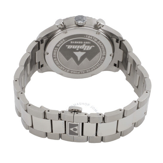 Silver-tone stainless steel case and bracelet. Silver-tone stainless steel bezel. Black dial with silver-tone hands and Arabic numeral hour markers. Minute markers around the outer rim. Dial Type: Analog. Luminescent hands and markers. Date display at the 6 o'clock position. Chronograph - three sub-dials displaying: 60 second, 30 minute and 1/10th of a second. Alpina Calibre AL-372 quartz movement. Scratch resistant sapphire crystal. Solid case back. Round case shape, case size: 41 mm, case thickness: 12.75 mm. Fold over clasp with a safety release. Water resistant at 100 meters / 330 feet. Functions: chronograph, big date, hour, minute, second. Startimer Pilot Series. Sport watch style. Watch label: Swiss Made. Alpina Startimer Pilot Chronograph Quartz Black Dial Men's Watch AL-372BW4S26B.