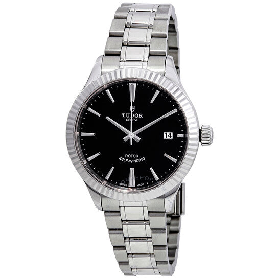 Stainless steel case with a stainless steel bracelet. Fixed fluted stainless steel bezel. Black dial with silver-tone hands and index hour markers. Minute markers around the outer rim. Dial Type: Analog. Date display at the 3 o'clock position. ETA caliber 2824 automatic movement with a 38-hour power reserve. Scratch resistant sapphire crystal. Screw down crown. Solid case back. Round case shape. Case size: 38 mm. Band length: 7 inches. Deployment clasp. Water resistant at 100 meters / 330 feet. Functions: date, hour, minute, second. Luxury watch style. Watch label: Swiss Made. Tudor Style Automatic Black Dial Men's Watch 12510-0003.