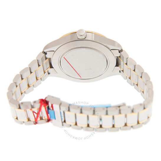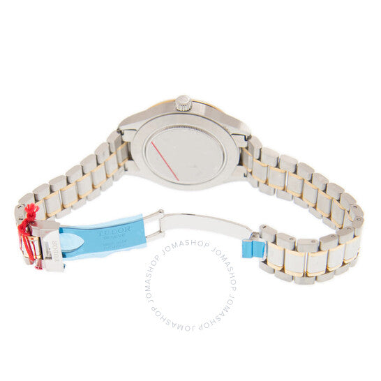 Silver-tone stainless steel case with a two-tone (silver-tone and rose gold-tone) stainless steel and 18kt rose gold bracelet. Fixed silver-tone stainless steel bezel. Black dial with silver-tone hands and index hour markers. Minute markers around the outer rim. Dial Type: Analog. Date display at the 3 o'clock position. Tudor Calibre T601 Automatic movement, based upon ETA 2824, containing 25 Jewels, bitting at 28800 vph, and has a power reserve of approximately 38 hours. Scratch resistant sapphire crystal. Solid case back. Round case shape, case size: 41 mm. Fold over clasp with a safety release. Water resistant at 100 meters / 330 feet. Functions: date, hour, minute, second. Additional Info: original box, manual (complete accessories). Style Series. Luxury watch style. Watch label: Swiss Made. Tudor Style Automatic Black Dial Men's Watch 12703-0003.