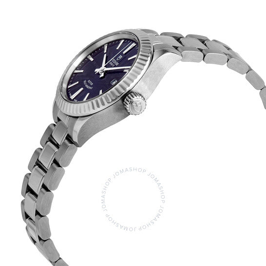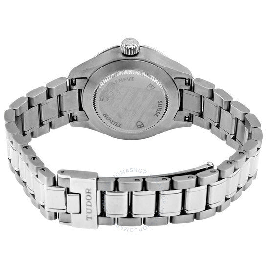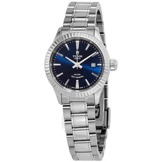Stainless steel case with a stainless steel bracelet. Fixed fluted stainless steel bezel. Blue dial with silver-tone hands and index hour markers. Minute markers around the outer rim. Dial Type: Analog. Date display at the 3 o'clock position. Tudor calibre 2671 automatic movement, based upon ETA 2671, containing 25 Jewels, bitting at 28800 vph, and has a power reserve of approximately 38 hours. Scratch resistant sapphire crystal. Screw down crown. Solid case back. Round case shape. Case size: 28 mm. Fold over clasp with a safety release. Water resistant at 100 meters / 330 feet. Functions: date, hour, minute, second. Style Series. Luxury watch style. Watch label: Swiss Made. Tudor Style Automatic Blue Dial Ladies 28 mm Watch M12110-0013.