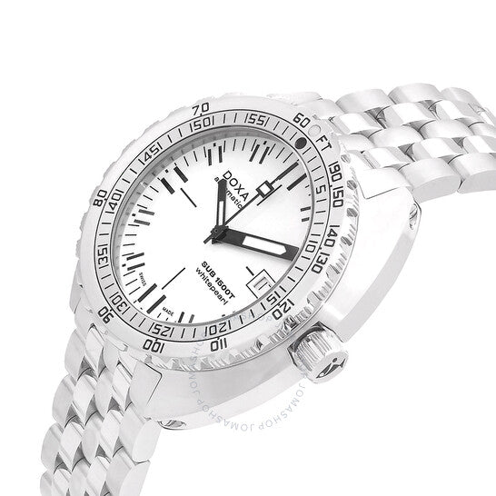 Silver-tone stainless steel case and bracelet. Uni-directional rotating silver-tone stainless steel bezel. White dial with black hands and index hour markers. Minute markers around the outer rim. Dial Type: Analog. Luminescent hands and markers. Date display at the 3 o'clock position. Automatic movement with a 50-hour power reserve. Scratch resistant sapphire crystal. Screw down crown. Solid case back. Round case shape, case size: 45.00 mm x 47.00 mm. Fold over clasp with a safety release. Water resistant at 1500 meters / 5000 feet. Functions: date, hour, minute, second. Sub 1500t Whitepearl Series. Dive watch style. Watch label: Swiss Made. Doxa SUB 1500T Whitepearl Automatic White Dial Men's Watch 883.10.011.10.