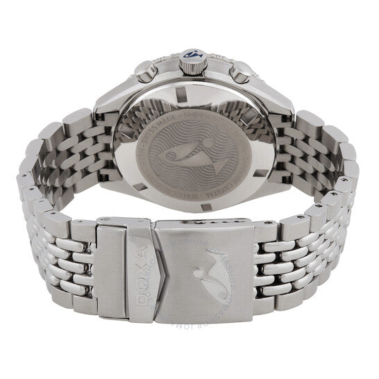 Silver-tone stainless steel case and bracelet. Uni-directional rotating blue ceramic bezel. Bue dial with silver-tone hands and index hour markers. Minute markers around the outer rim. Dial Type: Analog. Luminescent hands and markers. Chronograph - three sub-dials displaying: 60 second, 30 minute and 12 hour. Automatic movement with a 56-hour power reserve. Scratch resistant sapphire crystal. Screw down crown. Solid case back. Round case shape, case size: 42 mm. Fold over clasp with a safety release. Water resistant at 200 meters / 660 feet. Functions: chronograph, hour, minute, second. Sub 200 C-graph II Series. Sport watch style. Watch label: Swiss Made. Doxa SUB 200 C-Graph II Chronograph Automatic Men's Watch 797.10.201.10.