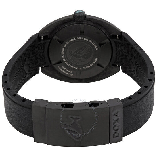 Black forged carbon case with a black rubber strap. Uni-directional rotating black forged carbon bezel. Turquoise dial with black hands and index hour markers. Dial Type: Analog. Luminescent hands and markers. Date display at the 3 o'clock position. ETA Caliber 2824-2 Automatic movement, based upon ETA 2824, containing 25 Jewels, bitting at 28800 vph, and has a power reserve of approximately 38 hours. Scratch resistant sapphire crystal. Screw down crown. Solid case back. Round case shape, case size: 42.5 mm. Water resistant at 300 meters / 1000 feet. Functions: date, hour, minute, second. Sub 300 Aquamarine Series. Dive watch style. Watch label: Swiss Movt. Doxa SUB 300 Aquamarine Automatic Watch 822.70.241.20.