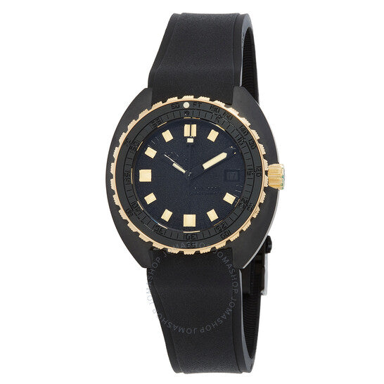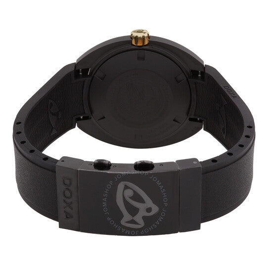 Black ceramic case with a black rubber strap. Uni-directional rotating black 18k 3n gold with ceramic inlay bezel. Black dial with luminous black hands and index hour markers. Minute markers around the outer rim. Dial Type: Analog. Luminescent hands and markers. Date display at the 3 o'clock position. ETA Caliber 2824-2 Automatic movement, based upon ETA 2824, containing 25 Jewels, bitting at 28800 vph, and has a power reserve of approximately 38 hours. Scratch resistant sapphire crystal. Screw down crown. Solid case back. Round case shape, case size: 42.50 x 44.5mm. Band width: 20 mm. Folding clasp. Water resistant at 300 meters / 1000 feet. Functions: date, hour, minute, second. Sub 300Ã Sharkhunter Series. Sport watch style. Watch label: Swiss Made. Doxa SUB 300Ã Sharkhunter Automatic Black Dial Men's Watch 830.20.101.20.