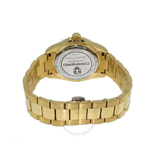Torino Carrero Men's Catania Subaquatic, Swiss Made Ronda - 515.24D, 24-hr GMT, Blue date dial and Ceramic rotating Bezel, Gold tone. Yellow gold-tone stainless steel case and bracelet. Uni-directional rotating blue ceramic bezel. Blue dial with yellow gold-tone hands and index hour markers. Minute markers around the outer rim. Dial Type: Analog. Luminescent hands and markers. Date display at the 3 o'clock position. Ronda Caliber 515.24D quartz movement. Scratch resistant mineral crystal. Screw down crown. Solid case back. Round case shape, case size: 42 mm, case thickness: 12 mm. Band width: 22 mm, band length: 8 inches. Deployment with push button release clasp. Water resistant at 100 meters / 330 feet. Functions: date, GMT, second time zone, hour, minute, second. Subaquatic Series. Casual watch style. Watch label: Swiss Made Quartz Movement. Torino Carrero Subaquatic GMT Quartz Blue Dial Men's Watch C1G10BU-BUBUJ.