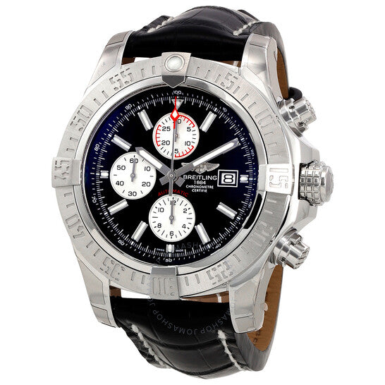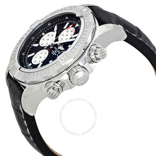 Stainless steel case with a black leather strap. Uni-directional rotating stainless steel bezel. Black dial with luminous silver-tone hands and index hour markers. Minute markers. 1/100th second markers around the outer rim. Dial Type: Analog. Luminescent hands and markers. Date display at the 3 o'clock position. Chronograph - three white sub-dials displaying: 60 second, 30 minute and 12 hour. Breitling calibre 13 automatic movement with a 42-hour power reserve. Scratch resistant sapphire crystal. Screw locked crown. Solid case back. Case size: 48 mm. Case thickness: 17.75 mm. Round case shape. Band width: 24 mm / 20 mm. Tang clasp. Water resistant at 300 meters / 1000 feet. Functions: chronograph, date, hour, minute, second. Luxury watch style. Watch label: Swiss Made. Breitling Super Avenger II Black Dial Men's Watch A1337111/BC29BKCT.
