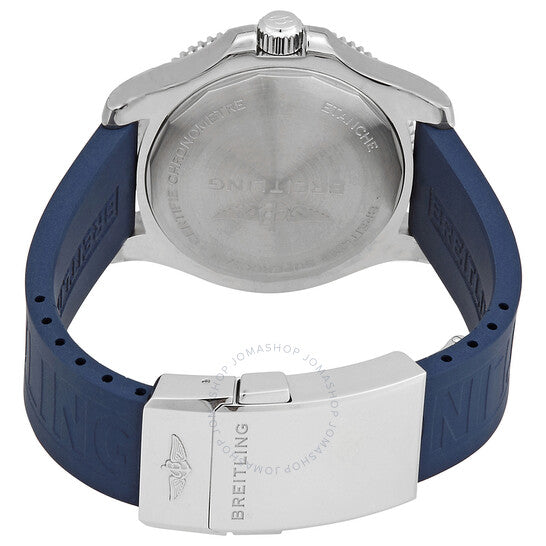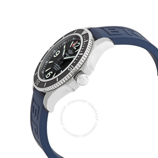 Silver-tone stainless steel case with a blue rubber strap. Uni-directional rotating coin edge black stainless steel bezel. Black dial with luminous silver hands and index hour markers. Arabic numerals mark the 6, 9 and 12 o'clock positions. Minute markers around the outer rim. Dial Type: Analog. Luminescent hands and markers. Date display at the 3 o'clock position. Breitling Calibre 17 Automatic movement, based upon ETA 2824-2, containing 25 Jewels, bitting at 28800 vph, and has a power reserve of approximately 42 hours. Scratch resistant sapphire crystal. Screw locked crown. Solid case back. Round case shape, case size: 42 mm, case thickness: 13.3 mm. Band width: 20 mm. Tang clasp. Water resistant at 500 meters / 1650 feet. Functions: date, hour, minute, second. Superocean 42 Series. Dive watch style. Watch label: Swiss Made. Breitling Superocean 42 Automatic Black Dial Men's Watch A17366021B1S1BL.