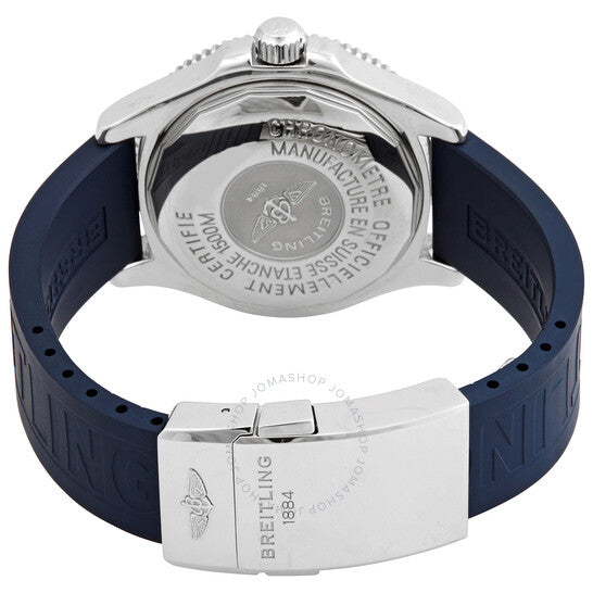 Silver-tone stainless steel case with a black pro diver (rubber) strap. Uni-directional rotating black stainless steel bezel. Black dial with lumious hands and Arabic numeral hour markers. Minute markers around the outer rim. Dial Type: Analog. Luminescent hands and markers. Date display at the 3 o'clock position. Breitling Calibre 17 Automatic movement, based upon ETA 2824-2, containing 25 Jewels, bitting at 28800 vph, and has a power reserve of approximately 42 hours. Scratch resistant sapphire crystal. Solid case back. Round case shape, case size: 42 mm, case thickness: 15 mm. Band width: 20 mm. Deployment clasp. Water resistant at 1500 meters / 5000 feet. Functions: chronometer, date, hour, minute, second. Superocean 42 Series. Sport watch style. Watch label: Swiss Made. Breitling Superocean 42 Black Dial Automatic Men's Watch A1736402-BA28BKPD.