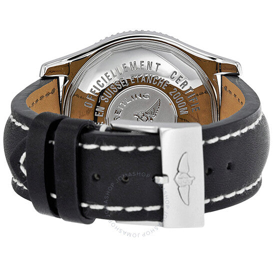 Stainless steel case with a black leather strap. Uni-directional rotating rose gold bezel. Black dial with luminous hands and index hour markers. Arabic numerals mark the 6 and 9 o'clock positions. Minute markers around the outer rim. Dial Type: Analog. Luminescent hands and markers. Date display at the 3 o'clock position. Automatic movement with 40 hour power reserve. Scratch resistant sapphire crystal. Screw down crown - two gaskets. Solid case back. Case diameter: 44 mm. Case thickness: 16.7 mm. Round case shape. Band width: 20 mm / 22 mm. Tang clasp. Water resistant at 2000 meters / 6600 feet. Functions: date, hour, minute, second. Luxury watch style. Watch label: Swiss Made. Breitling Superocean 44 Automatic Black Dial Men's Watch C1739112-BA77BKLT.