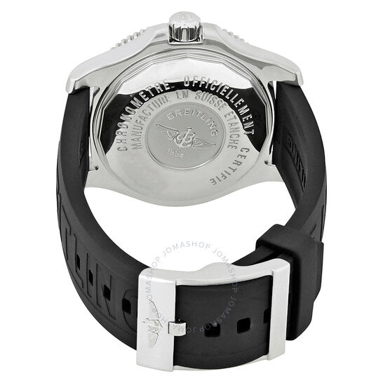 Stainless steel case with a rubber (black diver pro III) strap. Uni-directional rotating stainless steel bezel with a black top ring. Black dial with luminous silver-tone hands and index hour markers. Arabic numerals mark the 6 and 9 o'clock positions. Minute markers around the outer rim. Dial Type: Analog. Luminescent hands and markers. Date display at the 3 o'clock position. Breitling calibre 17 automatic movement with a 42-hour power reserve. Scratch resistant sapphire crystal. Screw locked crown. Solid case back. Round case shape. Case size: 44 mm. Case thickness: 16.7 mm. Band width: 22 mm. Tang clasp. Water resistant at 2000 meters / 6600 feet. Functions: date, hour, minute, second, chronometer. Luxury watch style. Watch label: Swiss Made. Breitling Superocean 44 Automatic Chronometer Black Dial Men's Watch A1739102/BA80-152S-A20SS.1.
