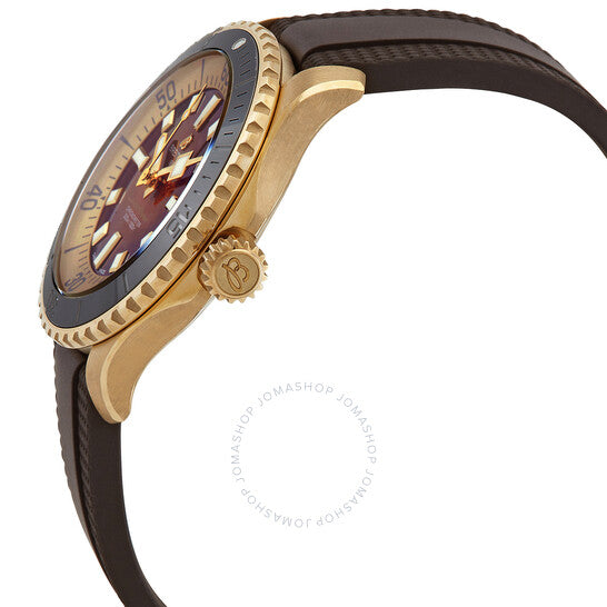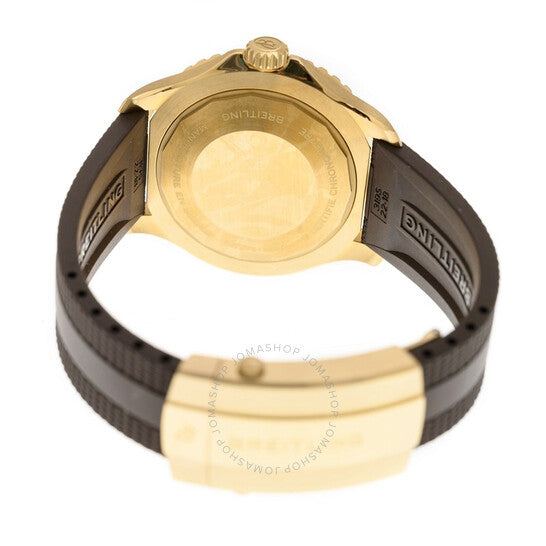 Bronze case with a brown rubber strap. Uni-directional rotating black bezel. Brown dial with gold-tone hands and index hour markers. Minute markers around the outer rim. Dial Type: Analog. Luminescent hands and markers. Breitling Calibre 17 Automatic movement, based upon ETA 2824-2, containing 25 Jewels, bitting at 28800 vph, and has a power reserve of approximately 42 hours. Scratch resistant sapphire crystal. Screw down crown. Round case shape, case size: 44 mm. Fold over clasp with a safety release. Water resistant at 300 meters / 1000 feet. Functions: date, hour, minute, second, chronometer. Additional Info: original box, international warranty card, manual (complete accessories). Superocean Series. Dive watch style. Watch label: Swiss Made. Breitling Superocean Automatic Chronometer Brown Dial Men's Watch N17376201Q1S1.