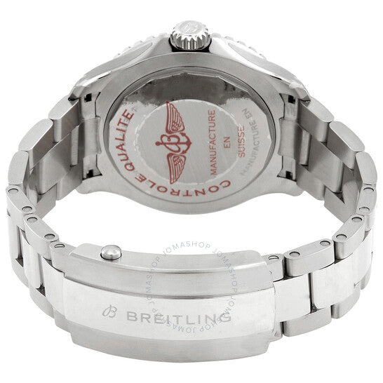Silver-tone stainless steel case and bracelet. Uni-directional rotating green stainless steel bezel. Green dial with silver-tone hands and index hour markers. Minute markers around the outer rim. Dial Type: Analog. Luminescent hands and markers. Breitling Calibre 17 Automatic movement, based upon ETA 2824-2, containing 25 Jewels, bitting at 28800 vph, and has a power reserve of approximately 42 hours. Scratch resistant sapphire crystal. Screw down crown. Solid case back. Round case shape, case size: 44 mm. Fold over clasp with a safety release. Water resistant at 300 meters / 1000 feet. Functions: hour, minute, second, chronometer. Additional Info: original box, manual (complete accessories). Superocean Series. Dive watch style. Watch label: Swiss Made. Breitling Superocean Automatic Chronometer Green Dial Men's Watch A17376A31L1A1.