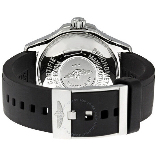 Stainless steel case with a black diver pro bracelet. Unidirectional black ion-plated bezel. Black and yellow dial with luminous hands and Arabic numeral hour markers. Minute markers around the outer rim. Dial Type: Analog. Luminescent hands and markers. Date display appears at the 3 o'clock position. Selfwinding mechanical movement. Scratch resistant sapphire crystal. Screw locked crown with two gaskets. Solid case back. Case diameter: 42 mm. Case thickness: 15 mm. Round case shape. Band width: 17 mm / 20 mm. Tang clasp. Water resistant at 1500 meters/ 5000 feet. Functions: hours, minutes, seconds, calendar. Sport watch style. Watch label: Swiss Made. Breitling Superocean Black and Yellow Dial Men's Watch A1736402-BA32BKPT.
