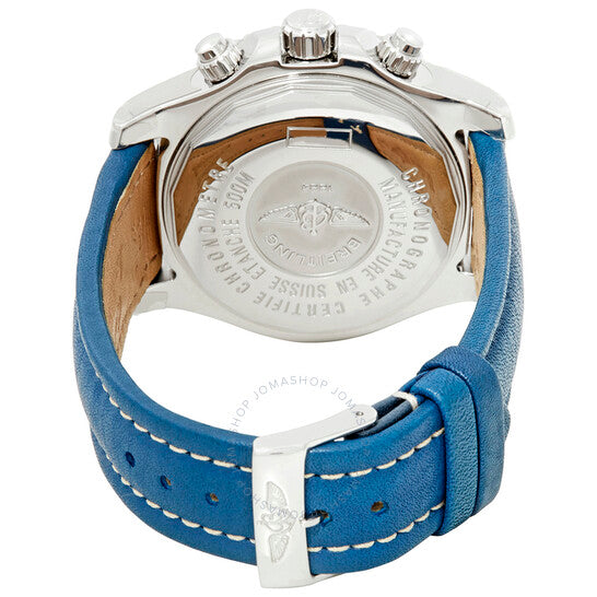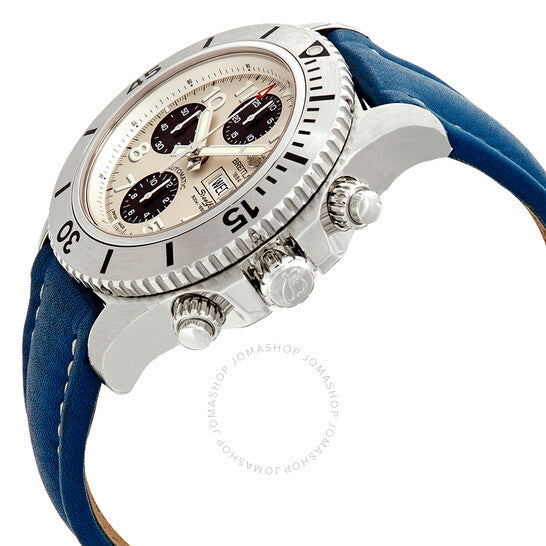Stainless steel case with a blue leather strap. Uni-directional rotating stainless steel bezel. Stratus silver dial with luminous silver-tone hands and Arabic numeral hour markers. Minute markers. 1/100th second markers around the outer rim. Dial Type: Analog. Luminescent hands and markers. Day of the week and date display at the 3 o'clock position. Chronograph - three black sub-dials displaying: 60 second, 30 minute and 12 hours. Breitling calibre 13 automatic movement with a 42-hour power reserve. Scratch resistant sapphire crystal. Screw down crown. Solid case back. Round case shape. Case size: 44 mm. Case thickness: 17 mm. Band width: 22 mm. Tang clasp. Water resistant at 500 meters / 1650 feet. Functions: chronograph, date, day of the week, hour, minute, second. Luxury watch style. Watch label: Swiss Made. Breitling Superocean Chronograph Automatic Stratus Silver Dial Men's Watch A13341C3/G782-105X-A20BA.1.