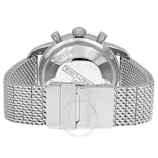 Stainless steel case with a stainless steel mesh bracelet. Unidirectional stainless steel bezel with an 18kt rose gold top ring. Black dial with luminous hands and index hour markers. Minute markers around the outer rim. Dial Type: Analog. Date display at the 3 o'clock position. Chronograph - three sub-dials displaying: 60 second, 30 minute and 12 hour. Automatic movement with a 42 hour power reserve. Scratch resistant sapphire crystal. Screw locked crown with two gaskets. Case diameter: 46 mm. Case thickness: 16.70 mm. Round case shape. Deployment clasp. Water resistant at 200 meters / 660 feet. Functions: chronograph, date, hour, minute, second. Luxury watch style. Watch label: Swiss Made. Breitling Superocean Chronograph Black Dial Automatic Men's Watch U1332012-B908SS.