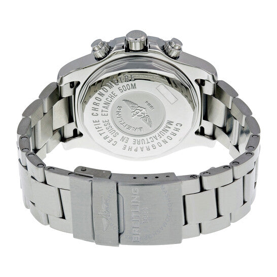 Stainless steel case with a stainless steel bracelet. Uni-directional rotating stainless steel bezel. Blue dial with luminous silver-tone hands and Arabic numeral hour markers. Minute markers. 1/100th markers around the outer rim. Dial Type: Analog. Luminescent hands and markers. Day of the week and date display at the 3 o'clock position. Chronograph - three sub-dials displaying: 60 second, 30 minute and 1/10th of a second. Breitling Calibre 13 automatic movement with about 42 hours of power reserve. Scratch resistant sapphire crystal. Screw down crown. Solid case back. Case size: 44 mm. Case thickness: 17.2 mm. Round case shape. Band width: 20.3 mm. Band length: 8 inches. Double locking fold over clasp. Water resistant at 500 meters / 1650 feet. Functions: chronograph, date, day, hour, minute, second. Dress watch style. Watch label: Swiss Made. Breitling Superocean Chronograph Blue Dial Men's Watch A13341C3-C893SS.