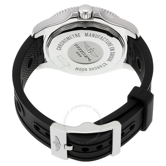 Stainless steel case with a black ocean racer rubber strap. Uni-directional rotating stainless steel bezel with a black top ring. Black dial with silver-tone hands and Arabic numeral hour markers. 24 hour markers. Minute markers around the outer rim. Dial Type: Analog. Luminescent hands and markers. Date display at the 3 o'clock position. Automatic movement with a 42-hour power reserve. Scratch resistant sapphire crystal. Screw down crown. Solid case back. Case diameter: 42 mm. Case thickness: 13.3 mm. Round case shape. Band width: 20 mm / 18 mm. Band length: 8.5 inches. Tang clasp. Water resistant at 500 meters / 1650 feet. Functions: date, hour, minute, second. Luxury watch style. Watch label: Swiss Made. Breitling Superocean II 42 Automatic Black Dial Stainless Steel Men's Watch A17365C9-BD67BKORT.