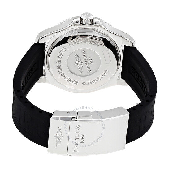 Stainless steel case with a black (diver pro III) rubber strap. Uni-directional rotating stainless steel bezel with a black top ring. Black dial with luminous silver-tone hands and Arabic numeral hour markers. 24 hour markers. Minute markers around the outer rim. Dial Type: Analog. Luminescent hands and markers. Date display at the 3 o'clock position. Breitling calibre 17 automatic movement with a 40-hour power reserve. Scratch resistant sapphire crystal. Screw locked crown. Solid case back. Case size: 42 mm. Case thickness: 13.30 mm. Round case shape. Band width: 20 mm / 18 mm. Deployment clasp. Water resistant at 500 meters / 1650 feet. Functions: date, hour, minute, second, 24 hour. Luxury watch style. Watch label: Swiss Made. Breitling Superocean II 42 Black Dial Men's Watch A17365C9/BD67BKPD3.
