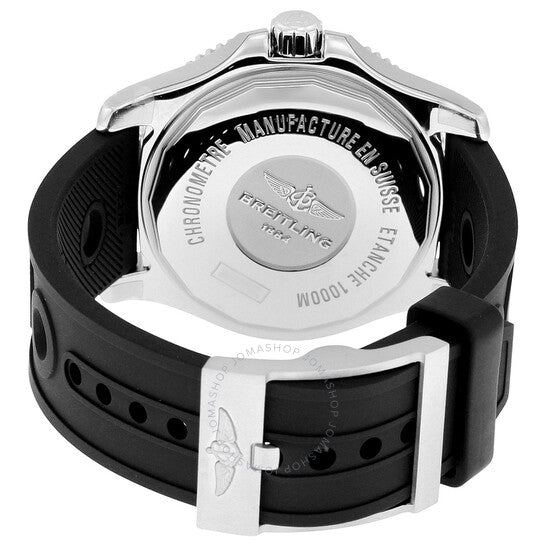 Stainless steel case with a black (ocean racer ii) rubber strap. Uni-directional rotating stainless steel bezel with a black inlay. Black dial with luminous silver-tone hands and Arabic numeral hour markers. 24 hour markers. Minute markers around the outer rim. Dial Type: Analog. Luminescent hands and markers. Date display at the 3 o'clock position. Breitling calibre 17 automatic movement with a 40-hour power reserve. Scratch resistant sapphire crystal. Screw locked crown - two gaskets. Solid case back. Round case shape, case size: 44 mm, case thickness: 14.20 mm. Band width: 22 mm / 20 mm. Tang clasp. Water resistant at 1000 meters / 3300 feet. Functions: chronometer, date, hour, minute, second. Dive watch style. Watch label: Swiss Made. Breitling Superocean II 44 Automatic Men's Watch A17392D7/BD68BKORT.