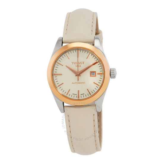 Silver-tone stainless steel case with a beige leather strap. Fixed 18k rose gold bezel. Cream opalin dial with rose gold-tone hands and index hour markers. Minute markers around the outer rim. Dial Type: Analog. Date display at the 3 o'clock position. Automatic movement with a 48-hour power reserve. Scratch resistant sapphire crystal. Transparent see through case back. Round case shape, case size: 29 mm, case thickness: 10.4 mm. Buckle clasp. Water resistant at 50 meters / 165 feet. Functions: date, hour, minute, second. T-my Lady Series. Watch label: Swiss Made. Tissot T-My Lady Automatic Cream Opalin Dial Ladies Watch T930.007.46.261.00.