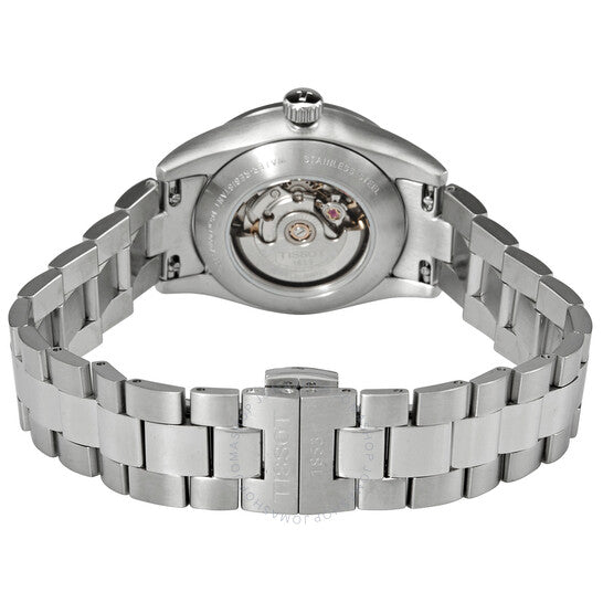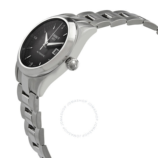 Stainless steel case with a stainless steel bracelet. Fixed stainless steel bezel. Anthracite gradient dial with silver-tone hands and index hour markers. Diamonds set at the 3, 6, 9 and 12 o'clock positions. Minute markers around the outer rim. Dial Type: Analog. Luminescent hands. Date display at the 3 o'clock position. Automatic movement with a 48-hour power reserve. Scratch resistant sapphire crystal. Pull / push crown. Transparent case back. Round case shape. Case size: 29.3 mm. Case thickness: 10.6 mm. Band width: 15 mm. Fold over clasp with a push button release. Water resistant at 100 meters / 330 feet. Functions: date, hour, minute, second. Additional Info: 8 diamonds on dial with vs-si clarity and 0.0160 carat. T-my Lady Series. Dress watch style. Watch label: Swiss Made. Tissot T-My Lady Automatic Diamond Anthracite Dial Ladies Watch T132.007.11.066.00.