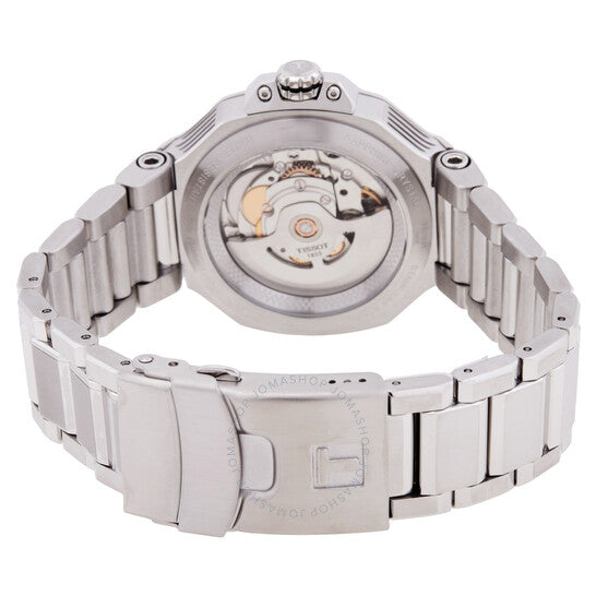 Silver-tone stainless steel case and bracelet. Fixed silver-tone stainless steel bezel. Blue dial with silver-tone hands and index hour markers. Minute markers around the outer rim. Dial Type: Analog. Luminescent hands and markers. Date display at the 3 o'clock position. Automatic movement. Scratch resistant sapphire crystal. Transparent see through case back. Round case shape, case size: 41 mm, case thickness: 11.28 mm. Band width: 12.95 mm. Fold over clasp. Water resistant at 100 meters / 330 feet. Functions: date, hour, minute, second. T-race Series. Sport watch style. Watch label: Swiss Made. Tissot T-Race Powermatic 80 Automatic Blue Dial Men's Watch T1418071104100.