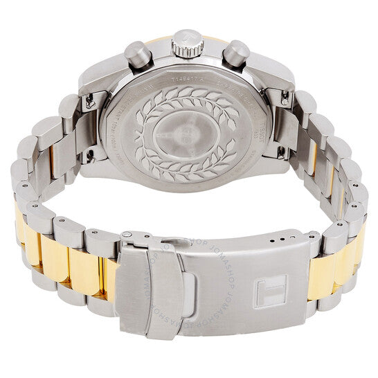 Two-tone (silver-tone and yellow gold-tone) 316L stainless steel with yellow gold PVD case with a two-tone (silver-tone and yellow gold-tone) stainless steel bracelet. Two tone (black & white) black stainless steel bezel. Black dial with gold-tone hands and index hour markers. Minute markers around the outer rim. Dial Type: Analog. Luminescent hands and markers. Chronograph - three sub-dials displaying: 60 second, 30 minute and 1/10th of a second. Quartz movement. Scratch resistant sapphire crystal. Screw down crown. Solid case back. Round case shape, case size: 40 mm, case thickness: 12.2 mm. Band width: 20 mm. Fold over clasp with a safety release. Water resistant at 100 meters / 330 feet. Functions: chronograph, hour, minute, second. T-sport Series. Sport watch style. Watch label: Swiss Made. Tissot T-Sport Chronograph Quartz Black Dial Men's Watch T149.417.22.051.00.